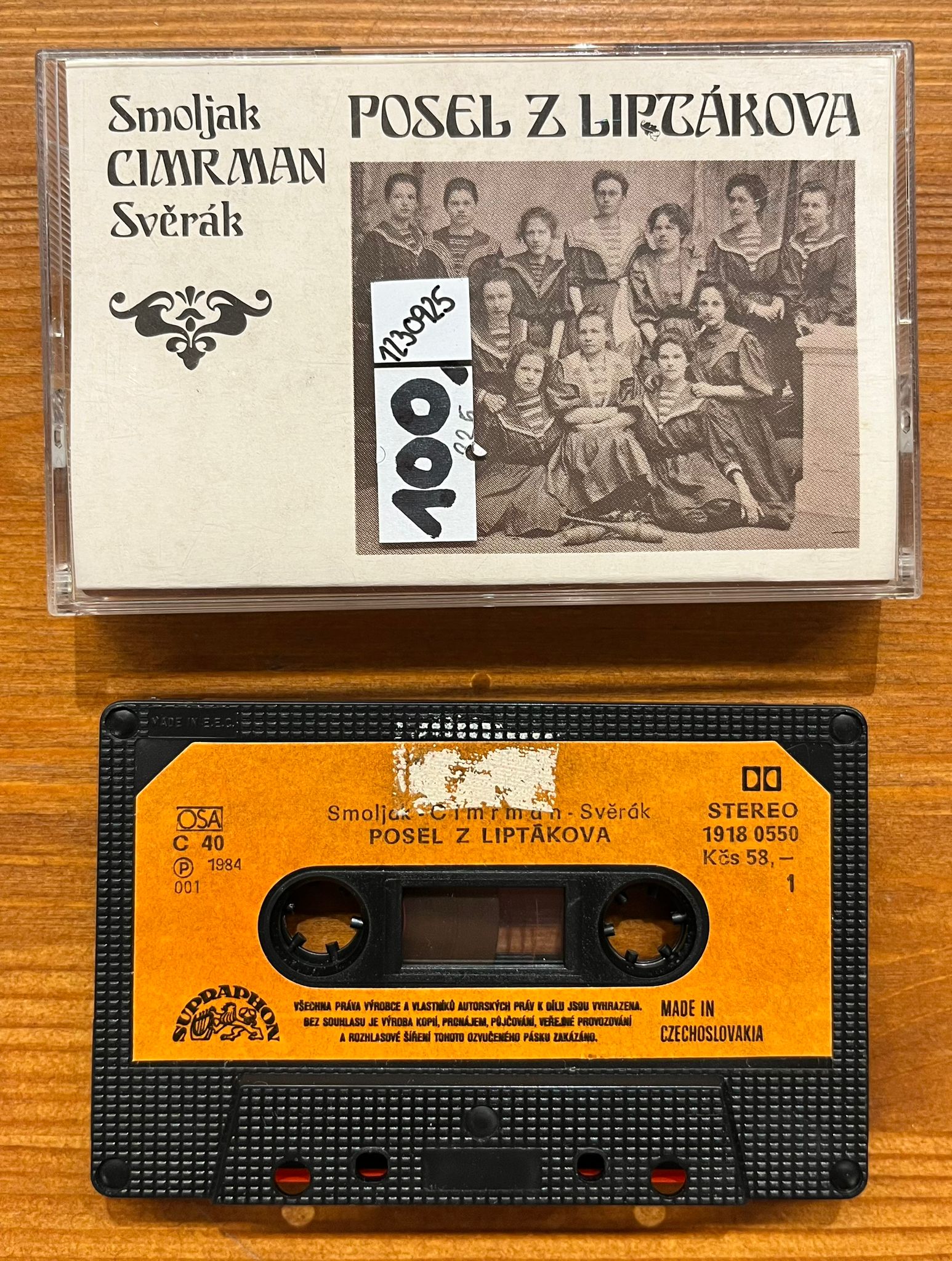 Stará cenovka na krabičce. Odřený štítek na kazetě.