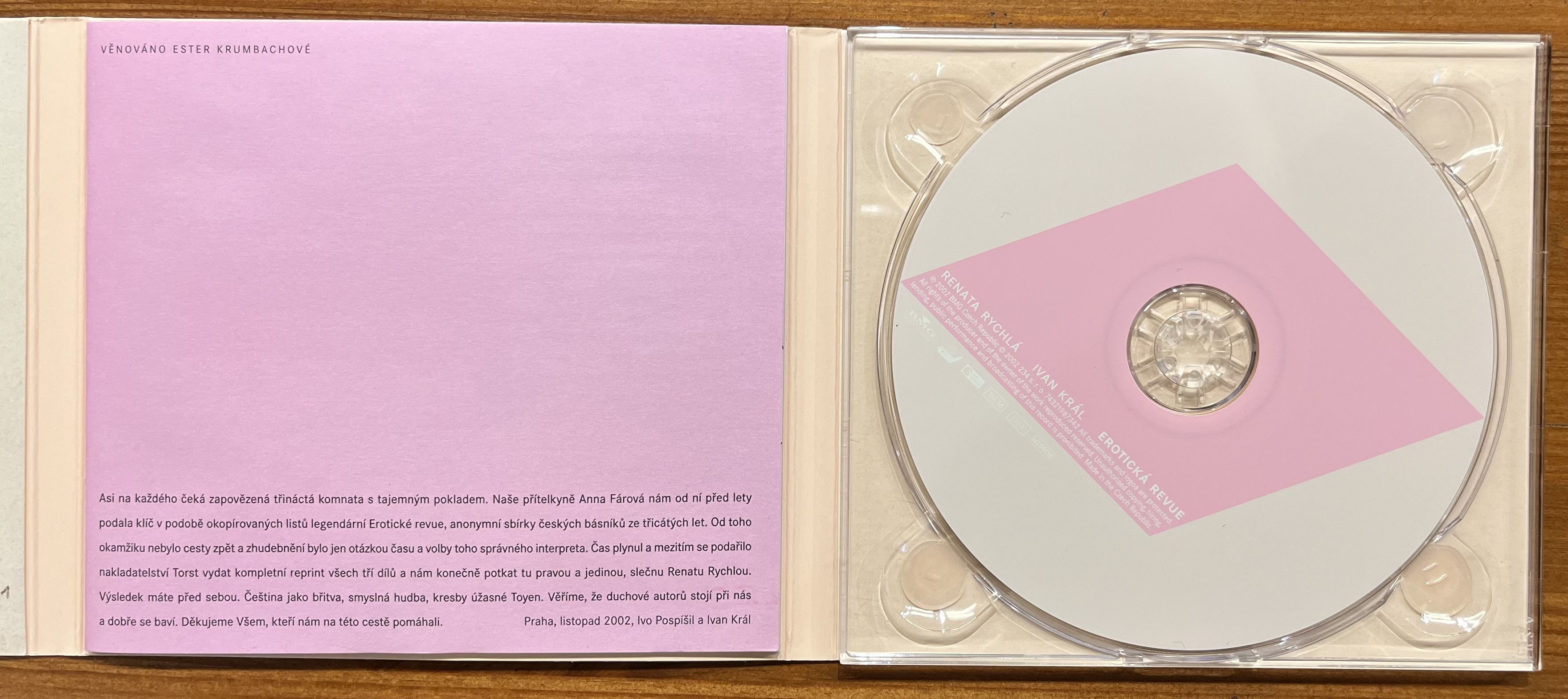 Číst více +21 %. CD Renata Rychlá, Ivan Král - Erotická revue. BMG Czech Republic, 2002. 2002 234 s. r. o. 74321987342. Včetně bookletu vlepeného uvnitř desek. Hezký stav CD. Trochu ušpiněný obal.